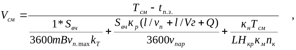 Сменная скорость Vсм проведения выработки комбайном со стреловидным рабочим органом при рельсовом транспорте может быть определена по следующей формуле: