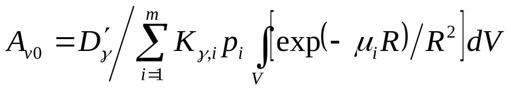 Проводя вычисления под знаком суммы в правой части выражения (10.10), и, используя вместо расчетного значения мощности дозы в левой части этого выражения ее измеренное значение непроточной ионизационной камерой, величину объемной активности в венттрубе найдем как отношение