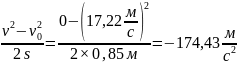 Яким буде прискорення, набуте тілом водія, що рухався зі швидкістю v0 = 62 км/год., у разі аварійного гальмування до повної зупинки (v = 0), якщо воно перемістилося на відстань s = 0,85 метра (разом із кріслом водія, бо людина була міцно і правильно пристебнута ременем безпеки)? Чи залишиться водій живим?