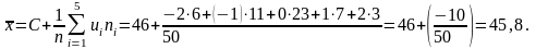 Приклад 5. У результаті статистичних досліджень випадкової величини Х отримано таку вибірку: 47, 45, 46, 45, 46, 47, 44, 46, 45, 46, 45, 46, 46, 44, 46, 48, 46, 45, 46, 47, 44, 46, 45, 45, 46, 44, 46, 48, 46, 46, 45, 47, 44, 46, 45, 45, 44, 48, 46, 46, 45, 47, 44, 46, 45, 46, 46, 47, 46, 47. Знайти незміщені оцінки генерального середнього та генеральної дисперсії.