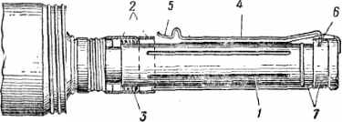 / — корпус рукоятки; 2 — рухлива муфта; 3 — пружина рухливої муфти; 4 — відкидна планка; 5 і 6 — пружинний і відігнутий кінці відкидної планки; 7 — відкидний ковпак із планкою