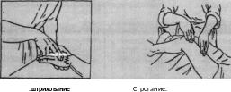 Строгание - делается одной рукой или двумя руками. Кисти устанавливаются друг за другом и поступательными движениями, напоминающими строгание, погружаются в ткани подушечками пальцев, производя их растяжение, смещение. Используется на обширных рубцах и при заболеваниях кожи (псориаз, экзема), где требуется исключить воздействие на пораженные участки, при атрофии отдельных мышц и мышечных групп с целью стимуляции.