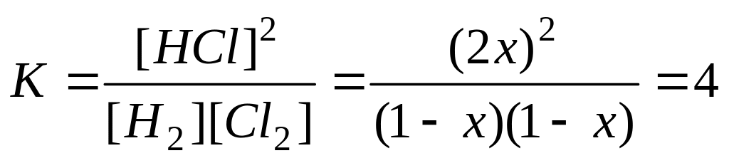 Нехай до моменту встановлення рівноваги концентрація хлору зменшилась на Х моль/л, тоді концентрація водню теж зменшиться на Х моль/л (за рівнянням реакції хлор та водень реагують у співвідношенні 1:1) . Концентрація хлороводню буде складати 2Х ( з рівняння реакції бачимо, що з 1 моль Cl2 утворюється 2 моль хлороводню)