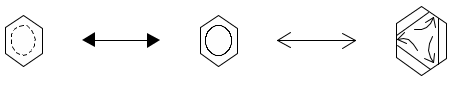 Ці р – електрони в бензені не поєднуються в пари, а є делокалізованими, тобто створюють спільну – електронну хмару, що рівномірно розподілена по всій молекулі (б), оскільки формулу бензену правильніше зображувати у вигляді рівнобічного шестикутника з вписаною в ньому циклічною –орбіталлю, що символізує секстет – електронів (в). На відміну від етиленових сполук, кожному С – С - зв’язку відповідає електронна густина лише одного р – електрона. Такий зв’язок має назву ароматичного. Але часто використовують й формули Кекуле у вигляді рівнобічного шестикутника з трьома кон’югованими подвійними зв’язками: