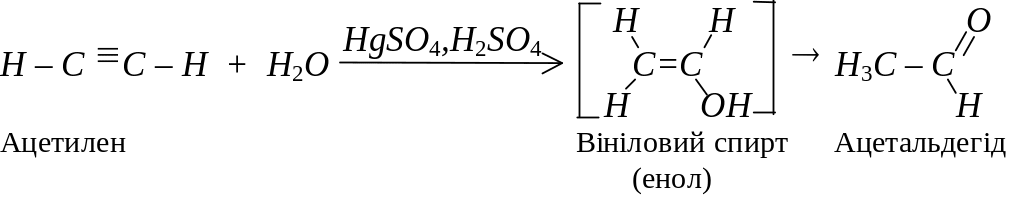а) реакція Кучерова (гідратація). Приєднання води ацетиленових сполук теж відбувається в дві стадії. Спочатку утворюється нестійкий енол, який відразу ж ізомерізується в карбонільну сполуку: