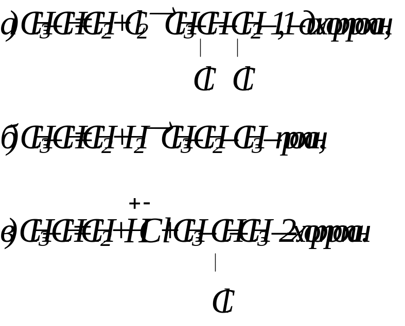 Напишіть рівняння реакцій взаємодії пропену з Cl2, H2 i HCl. Дати назву отриманим сполукам.