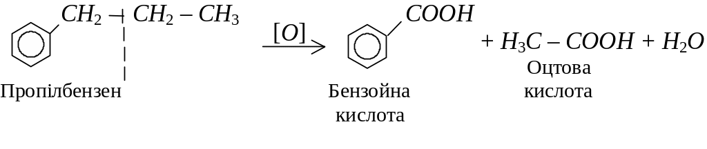 Гомологи бензену, на відміну від бензену, легко окислюються до карбонових кислот, причому, незалежно від довжини бічного вуглецевого ланцюга, карбоксильна група кислоти, що утворюється, завжди сполучена з бензеновим ядром: