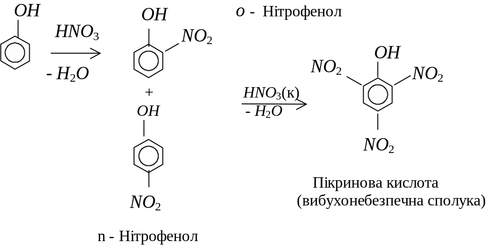 Для фенолів також характерні реакції електрофільного (Se) заміщення по бензеновому кільцю, наприклад, нітрування: