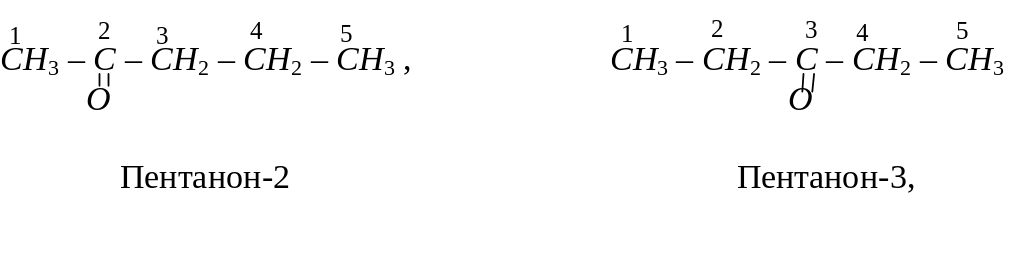 Ізомерія кетонів залежить як від будови алкільних груп-радикалів, так і від положення карбонільної групи в молекулі кетону. Кетон, для якого починається ізомерія, має в своєму складі п’ять атомів вуглецю. Серед ізомерів цього кетону: