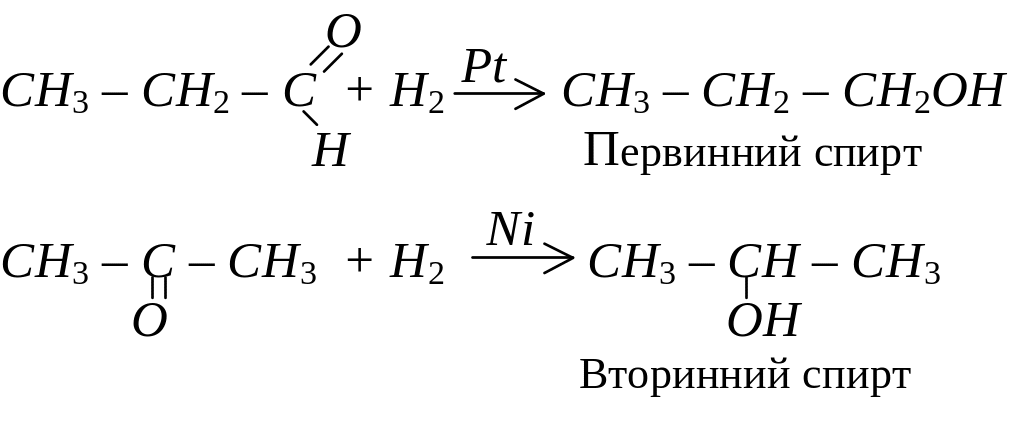 За наявності нікелевих або платинових каталізаторів альдегіди і кетони приєднують водень і відновлюються до спиртів: альдегіди – до первинних спиртів, кетони – до вторинних спиртів: