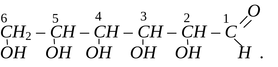 Хімічний склад моносахаридів описується загальною формулою СnH2nOn. Молекули моносахаридів містять від 4 до 10 атомів вуглецю, проте найбільше значення мають моносахариди з 5 і 6 атомами вуглецю, тобто пентози С5H10O5 і гексози С6H12O6, а з гексоз – глюкоза (виноградний цукор) і фруктоза (фруктовий цукор). Структурна формула глюкози виведена на основі її хімічних властивостей і має вигляд: