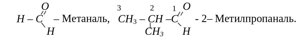 За систематичною номенклатурою назви альдегідів утворюються з назв відповідних вуглеводнів, додаючи до них суфікс – аль. Головний ланцюг в молекулі альдегіду вибирають так, щоб в нього обов’язково входив атом карбону карбонільної групи, наприклад:
