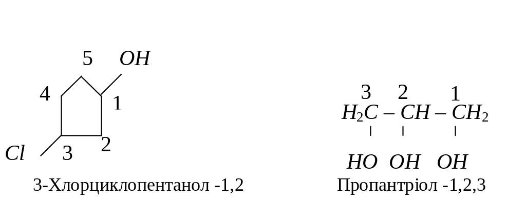 За систематичною номенклатурою назви спиртів утворюють, додаючи до назви відповідного вуглеводню суфікс – ол. Якщо молекула містить декілька гідроксильних груп, то до назви додають суфікси – діол, – триол ... Нумерацію вуглецевого радикалу починають з атома карбону, який найближче розташований до гідроксильної групи, а місце розміщення гідроксилу позначають локантом, наприклад: