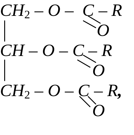 Багатоатомні спирти утворюють з кислотами повні або неповні естери. Наприклад, гліцерин взаємодіє з вищими карбоновими кислотами з утворенням тригліцеридів (жирів). Склад та будову жирів можна позначити загальною формулою: