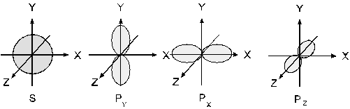 Орбіталі можуть мати форму кулі (s-орбіталі, l=0), гантелі (р-орбіталі, l=1) (див. рисунок 1), або більш складної форми (d-, f- l=2 та 3 відповідно).