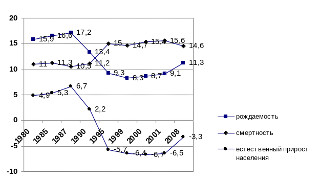 Рис. 2 Динамика рождаемости, смертности и естественного прироста населения в России (1980-2008 гг.)