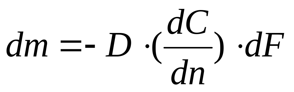 Количественное явление диффузии характеризуется законом Фика: кол-во в-ва (dm), диффундирующего ч/з слой в единицу времени, пропорционально площади слоя (dF), перпендикулярно направлению диффундирующего потока и grad концентраций в направлении диффузии (dC/dn).
