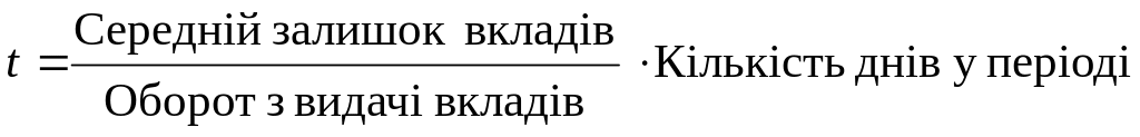 де t1, t0 — тривалість одного депозитного обороту в днях відповідно у звітному та базисному періодах; О01дн. — одноденний оборот депозитів (дебетовий) по поверненню; В — умовне вивільнення ресурсів; З — умовне залучення ресурсів.
