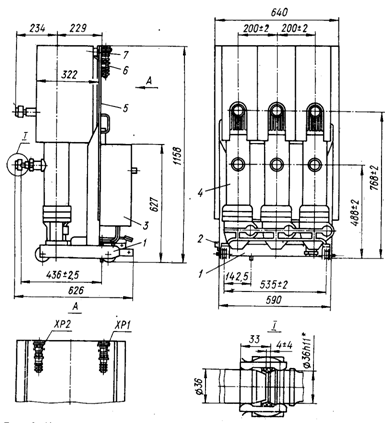 Конструктивне виконання вимикача. Вимикач складається з таких основних частин (рис. 1, 2): основи 1; трьох полюсів 4; електромагнітного приводу 3 (габаритні, монтажні і приєднувальні розміри приводу наведені на рис. 3); фасадної перегородки 5; штепсельних роз'ємів 6; ізоляційного кожуха 7 (рис. 2) для вимикачів на номінальну силу струму 630, 1000 А, а також на 1250, 1600 А; пластини 2 (рис. 1 і 2) для підйому шторковогомеханізму в КРП.
