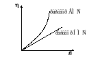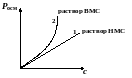 Зависимость осмотического давления от концентрации для растворов НМС (1) и растворов ВМС (2)