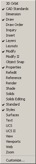 Удобно выбирать имя требующейся панели инструментов из списка контекстного меню (рис. 1.8), которое появляется при нажатии правой кнопки мыши, если ее указатель находится на любой пиктограмме панелей инструментов. Если же указатель мыши находится в фоновой области панелей инструментов, то список панелей инструментов можно получить после выбора пункта ACAD контекстного меню, показанного на рис. 1.7.