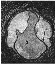 1 - хитиновая оболочка ларвоцисты альвеококка; 2 - полость ларвоцисты альвеококка