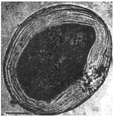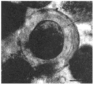 Рис.5. Новый тип зародышевых элементов цистного эхинококка: зрелый ввернутый протосколекс, атипично сформировавший утолщенную хитиновую оболочку, в пунктате из эхинококковой кисты в печени больной С. Нативные препараты. Длина измерительной шкалы 50 мкм
