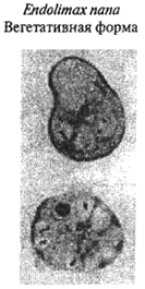 1-4 ядра меньшего размера, различаются с трудом из-за гликогена в средней части цисты и множества хроматиновых тел