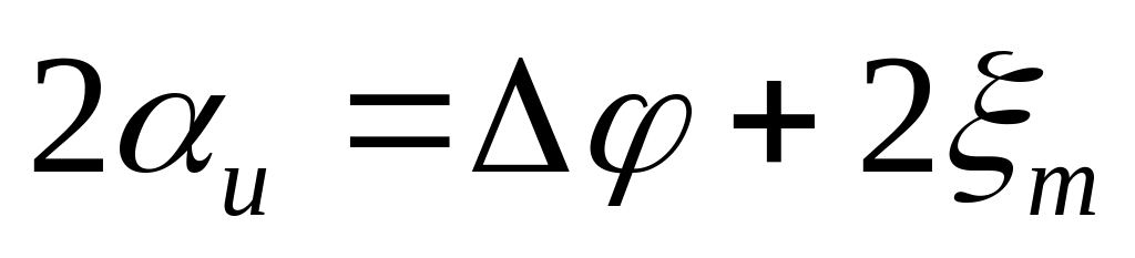В меридиональном сечении отражателя, проходящем через среднюю точку пластины, фокальные лучи упадут на пластину в пределах угла Δφ (рис 4.10,а). Вследствие одинакового положения нормали N к поверхности в любой точке, отраженные фокальные лучи точек Mi-1 и Mi, образуют между собой угол Δα=Δφ. Таким образом, угол разворота фокальных лучей в меридиальной плоскости равен угловому размеру пластины в той же плоскости. Полный угол излучения пластины в меридиальном сечении будет
