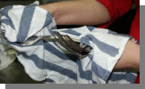 Приборы полируйте полотенцем (вафельным полотном), опустив сначала в контейнер с горячей водой и лимоном (возьмите у повара). Возьмите край полотенца в левую руку, в нее же положите 6-8 приборов. Начинайте быстро натирать их другим краем полотенца, правой рукой (см.фото). Во время процедуры производите контроль их чистоты и целостности.