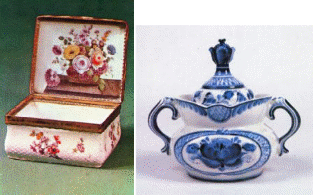 Рис. 3.6. Фарфорові вироби Росії: а) – табакерка. Імператорський фарфоровий завод (Петербург, кінець XVIII ст.); б) – гжель, ХХ ст.