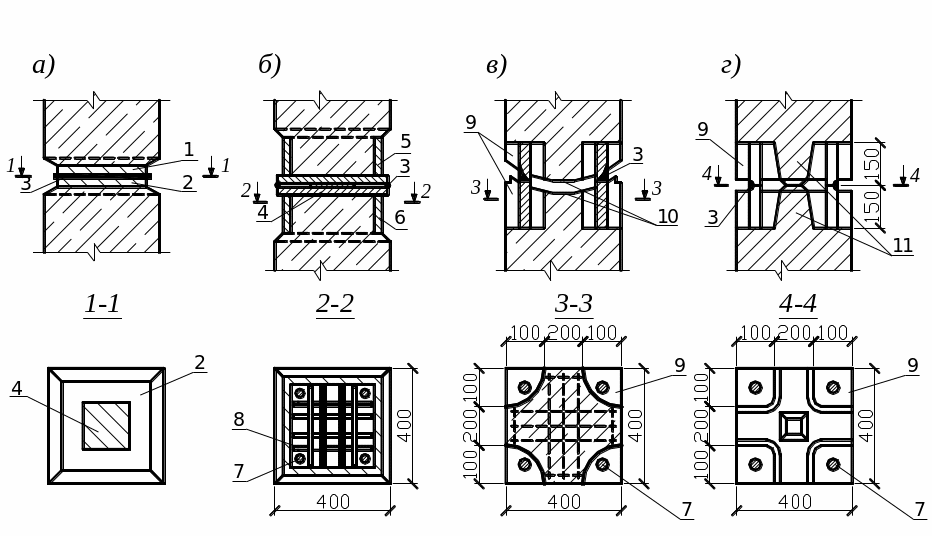 Рис.4.4. Стыки сборных ж.б. колонн с гибкой арматуройа – стык колонн с помощью стальных листов (пластин), заанкеренных в бетон; б – стык колонн с помощью стальных оголовников, приваренных к продольной арматуре; в – сферический безметаллический стык сборных ж.б. колонн; г – плоский безметаллический стык ж.б. колонн (серия ИИ-04); 1 – стальная пластина верхнего оголовка; 2 – тоже, нижнего огловка; 3 – сварной шов; 4 – центрирующая металлическая прокладка; 5 и 6 – верхний и нижний стальной оголовник; 7 – продольная арматура; 8 – поперечная арматура; 9 – стыковые ниши; 10 – сферические бетонные поверхности; 11 – центрирующий бетонный выступ.