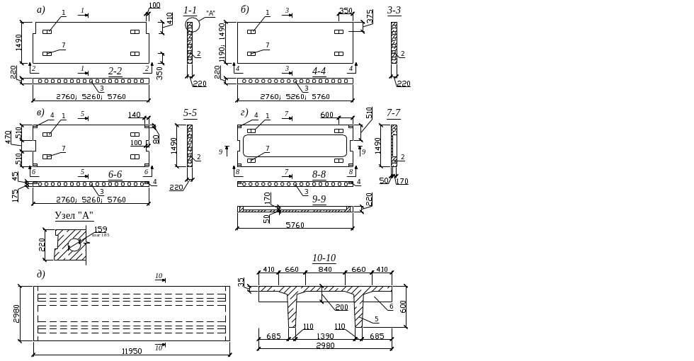 а – пристенная; б – рядовая; в, е – связевые; д – предварительно-напряженный настил типа ТТ-12 (пролетом 12м). 1 – ниши для строповочных петель 150х80; глубина 70; 2 – каналы пустот (диаметр 159; шаг 185) на торцовых гранях плит; 3 – ниши растворной шпонки (диаметр 120; шаг 200) на продольных гранях плит; 4 – подрезки для выпусков арматуры 140х80; глубина 45; 5 – продольные ребра; 6 – поперечные ребра; 7 – монтажные петли. Ширина настилов 1200 мм, но м.б. увеличена до З и даже 4,5 м при