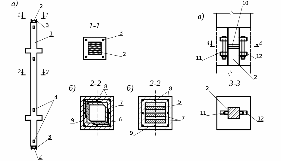 а – общий вид колонны; б – типы сечения стальных сердечников; в – стык колонны; 1 – колонна; 2 – стальной сердечник; 3 – выпуски армтурных стержней; 4 – стальные закладные детали; 5 – полосы толщиной до 60мм; 6 – уголки; 7 – сварной шов; 8 – стержни продольной гибкой арматуры; 9 – хомуты; 10 – прокладная фрезерованная стальная пластина; 11 – монтажные болты; 12 – стальные ушки.