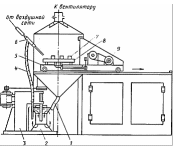 Рис. 6.13. Схема полуавтоматической установки для струйно-абразивной обработки деталей: 1 – корпус; 2 – привод; 3 – ковши; 4 – вытяжная вентиляция; 5 – барабан; 6 – надсопельный бункер; 7 – сопла; 8 - бункер; 9 – электрошкаф