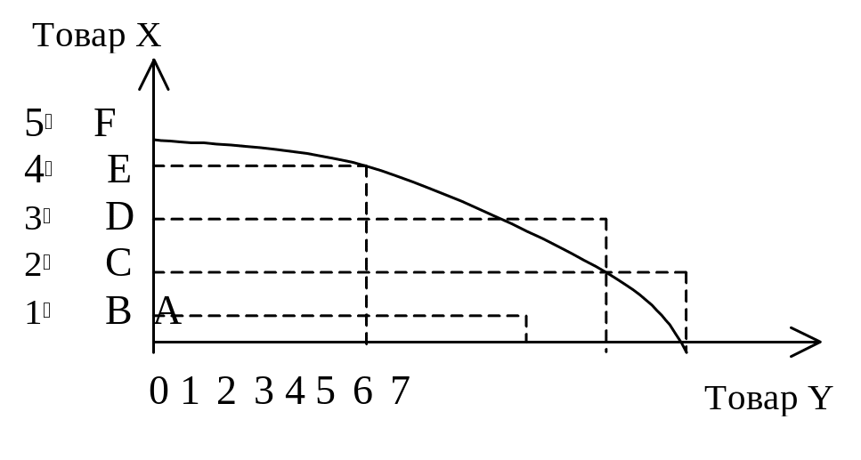 На графике изображена кривая производственных возможностей, каждая точка которой показывает количество товара X, производимого при полном использовании всех имеющихся ресурсов, взамен товара Y. Точки А, Е, F представляют производственные возможности общества в производстве товаров X и Y. Если производится два товара X, то семь товаров Y. Точка B показывает, что производство организованно неэффективно и есть неиспользованные ресурсы, например, рабочая сила. Точки C и D показывают уровень производства, недостижимый при данной технологии.