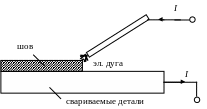 - Сварка (полуавтоматическая или автоматическая) защищенной дугой (среда аргона или углекислого газа) и плавящимся электродом. Неизолированная электродная проволока подается в зону сварки через горелку с помощью механизма подачи. В горелку подается газ. Сварка в среде аргона применяется при питании дуги как от источника переменного, так и постоянного тока.