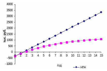 Суммируя потоки наличности за каждый год расчетного периода, определяется накопленный поток наличности – НПНt. А суммируя чистую текущую стоимость – накопленную чистую текущую стоимость НЧТСt. Расчет показателей экономической эффективности инвестиций приведен в таблице 7.2 График окупаемости инвестиций показан на рисунке 7.1.