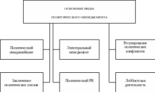 В настоящее время можно говорить о следующих основных видах политического менеджмента: политический имиджмейкинг, политический РК, электоральный менеджмент, политический брендинг, регулирование политических конфликтов, лоббистская деятельность, заключение политических союзов и соглашений. Дадим краткую характеристику каждому из них.