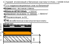 “А” Постоянные нагрузки Гравий втопленный в битумную мастику 2-а наплавляемых слоя на битумной мастике Цементно - песчаная стяжка Утеплитель Керамзит по уклону Пароизоляция Железобетонная плита покрытия пустотная |