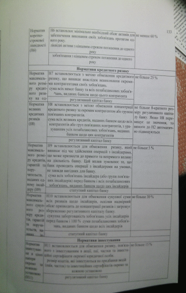 1. Нормативи капіталу: мінімального розміру регулятивного капіталу – Н1 (120 млн. грн.); достатності (адекватності) регулятивного капіталу – Н2 (не менше 10%); (коефіцієнт) співвідношення регулятивного капіталу до сукупних активів (Н3) – Н3 (не менше 9%);(коефіцієнт) співвідношення регулятивного капіталу до зобов’язань (Н3-1) (не менше 10%).