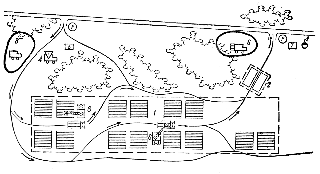 Рис. 1. Схема розташування пункту навантаження труб (варіант): 1 - майданчик навантаження труб; 2 - майданчик навантаження обладнання; 3 - майданчик очікування для порожніх автомобілів, 4 - заправний пункт; 6 - майданчик технічного приговування; 6 - майданчик збору завантажених автомобілів; 7 - контрольно-технічний пункт; 8 - автокрани