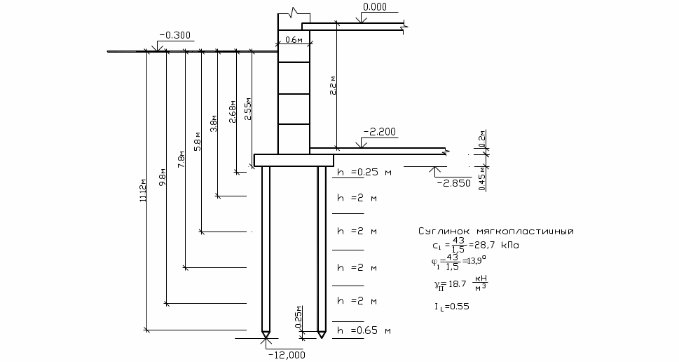 Назначаем глубину заложения подошвы ростверка таким образом, чтобы отметка обреза ростверка относительно нулевой отметки составила: