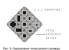 Величина печатной точки задается другим, яркостным разрешением и выражается в dpi. Сетка печатного разрешения намного чаще, чем линиатура, она имеет разрешения от 300 до 4000 dpi. Она определяет размер конкретной печатной точки: размер задается числом ячеек печатного разрешения, занятых краской.