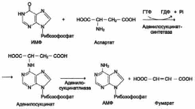 реакция переноса аминогруппы от аспартата на ИМФ (инозинмонофосфат), образование АМФ и фумарата;