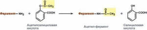 Еще один пример связан с ингибированием ацетилсалициловой кислотой (аспирином) ключевого фермента синтеза простагландинов – циклооксигеназы. Эта кислота входит в состав противовоспалительных средств и используется при воспалительных заболеваниях и лихорадочных состояниях. Присоединение ацетильной группы к аминогруппе в активном центре фермента вызывает инактивацию последнего и прекращение синтеза простагландинов.