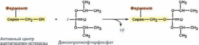 Например, вещество диизопропилфторфосфат прочно и необратимо связывается с гидроксигруппой серина в активном центре фермента ацетилхолинэстеразы, гидролизующей ацетилхолин в нервных синапсах. Ингибирование этого фермента предотвращает распад ацетилхолина в синаптической щели, в результате чего медиатор продолжает оказывать воздействие на свои рецепторы, что бесконтрольно усиливает холинергическую регуляцию. Аналогичным образом действуют боевые фосфоорганические вещества (зарин, зоман) иинсектициды (карбофос, дихлофос).