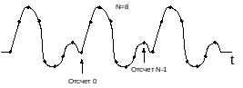Из описанного семейства преобразований к цифровой обработке сигналов и изображений имеет отношение дискретное преобразование Фурье, которое оперирует дискретной по времени выборкой периодического сигнала во временной области. Для того, чтобы быть представленным в виде суммы синусоид, сигнал должен быть периодическим. Но в качестве набора входных данных для ДПФ доступно только конечное число отсчетов (N) рис. 1.