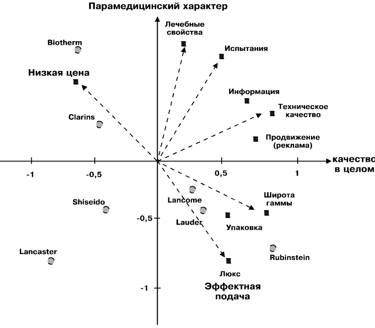 Вторая ось (вертикальная) определяет лечебные свойства различных товарных марок, их парамедицинский характер, многочисленные испытания в лаборатории. Этой группе атрибутов противостоит атрибут «эффектная подача». Каждая товарная марка имеет свою позицию на карте, которая характеризуется определенным сочетанием атрибутов и отражает ее восприятие потребителями.