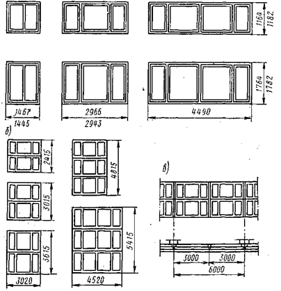 Рисунок 9. Деревянные оконные переплеты: а) -оконные блоки; б) -схемы заполнения оконных проемов; в) -схема ленточного остекления.